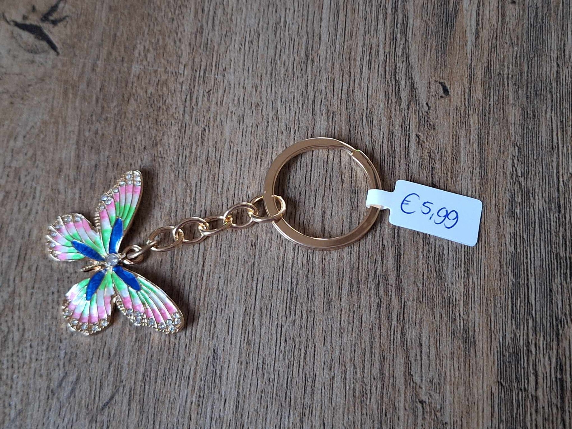 De sleutelhanger is handgemaakt met een leuk dier figuurtje : vlinder met glimsteentjes !!