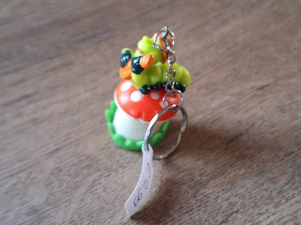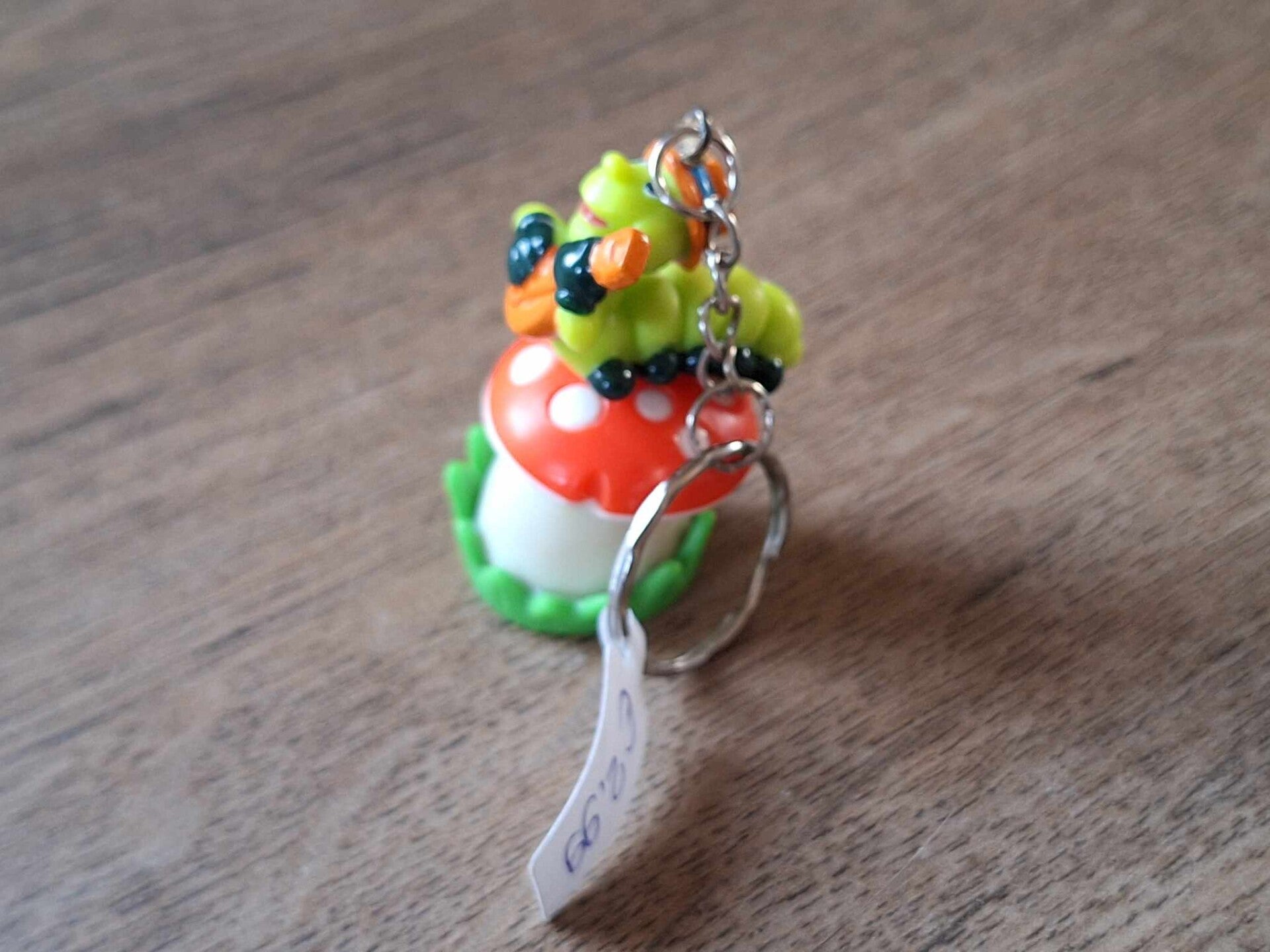 De sleutelhanger is handgemaakt met een leuk figuurtje : rups op paddenstoel !!Het figuurtje is ongeveer 5cm groot.Materiaal : kunststof.
