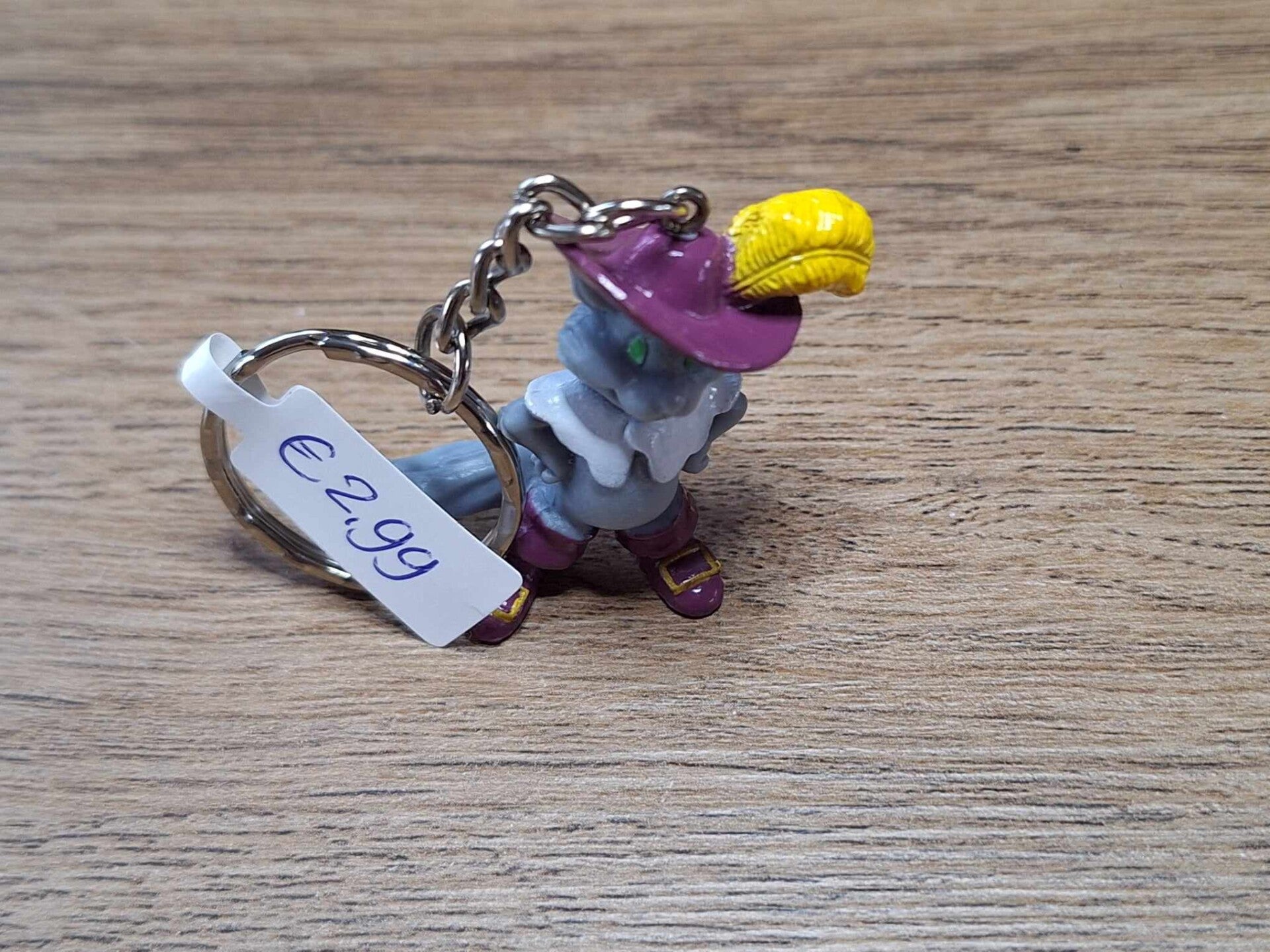 De sleutelhanger is handgemaakt met een leuk sprookjes figuurtje : de gelaarsde kat !!Het figuurtje is ongeveer 4cm groot.Materiaal : pvc.