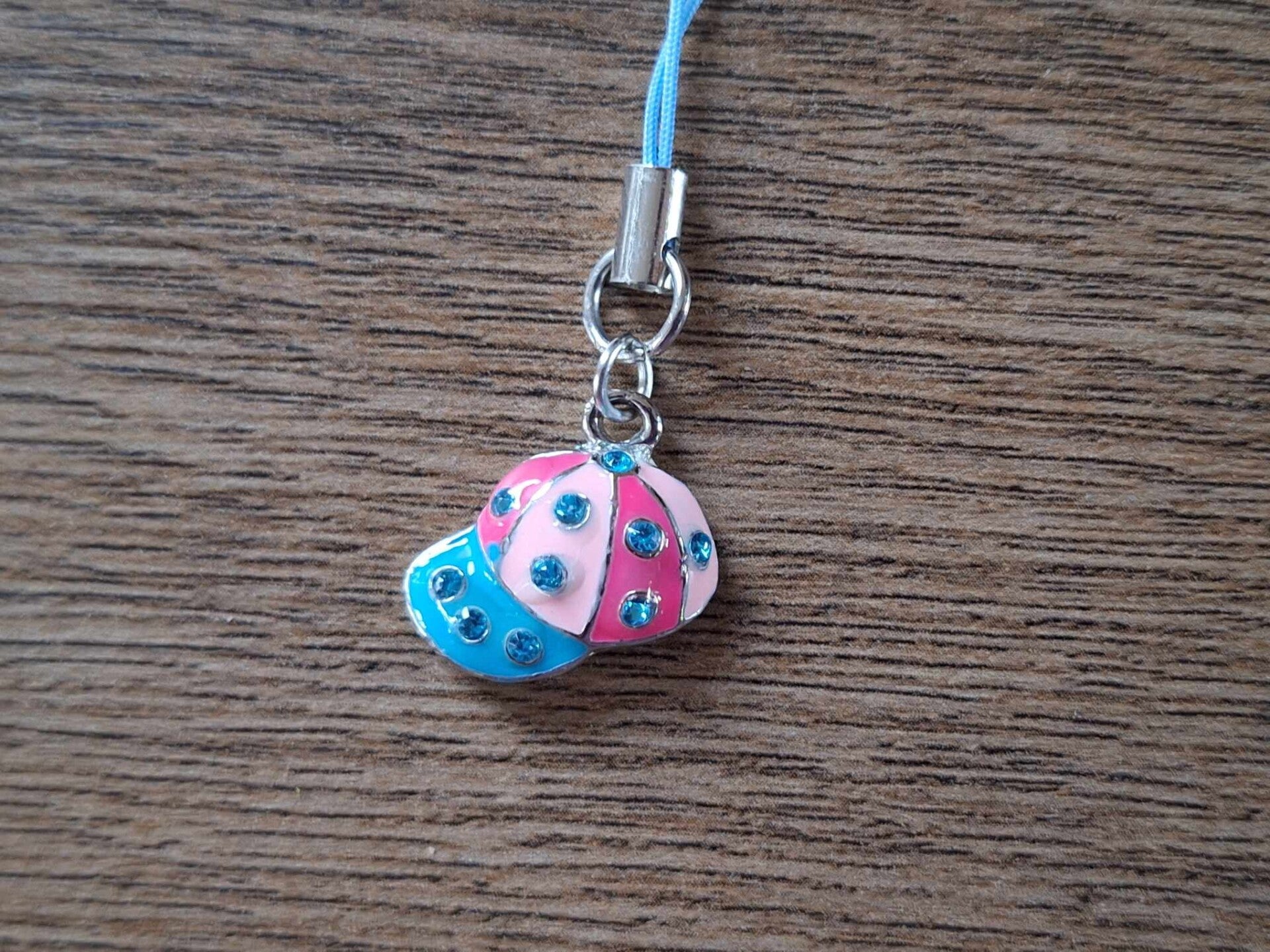 De telefoonhanger is handgemaakt met een mooi hangertje : Petje met glimmende blauwe steentjes !!