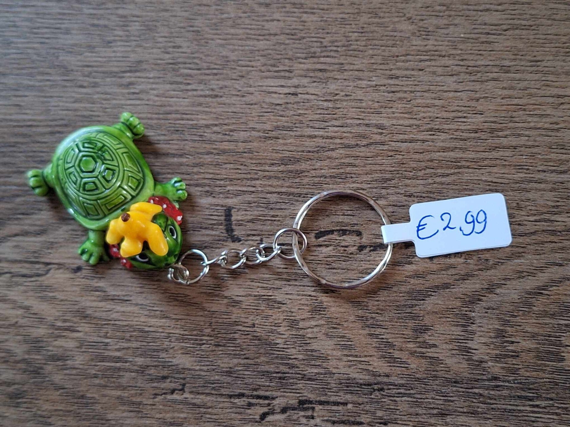 Leuk om aan een sleutel of tas te hangen, of als cadeau te geven.De sleutelhanger is handgemaakt met een leuk figuurtje : schildpadje !!Het figuurtje is ongeveer 4cm groot.Materiaal : kunststof.