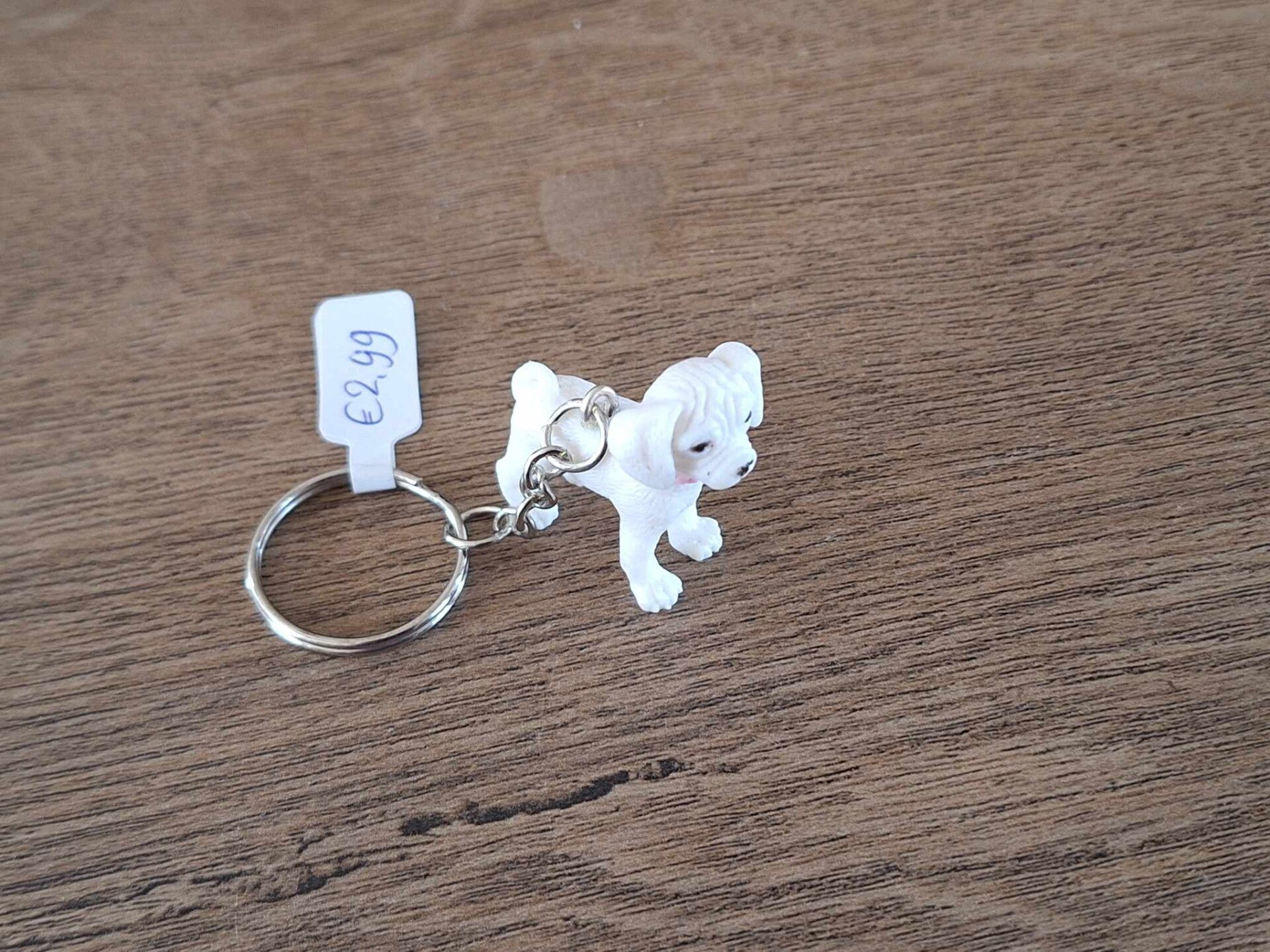 Leuk om aan een sleutel of tas te hangen, of als cadeau te geven.De sleutelhanger is handgemaakt met een leuk dier figuurtje : Wit Hondje !! Het figuurtje is ongeveer 3,5cm hoog en ongeveer 3cm lang.Materiaal : PVC.