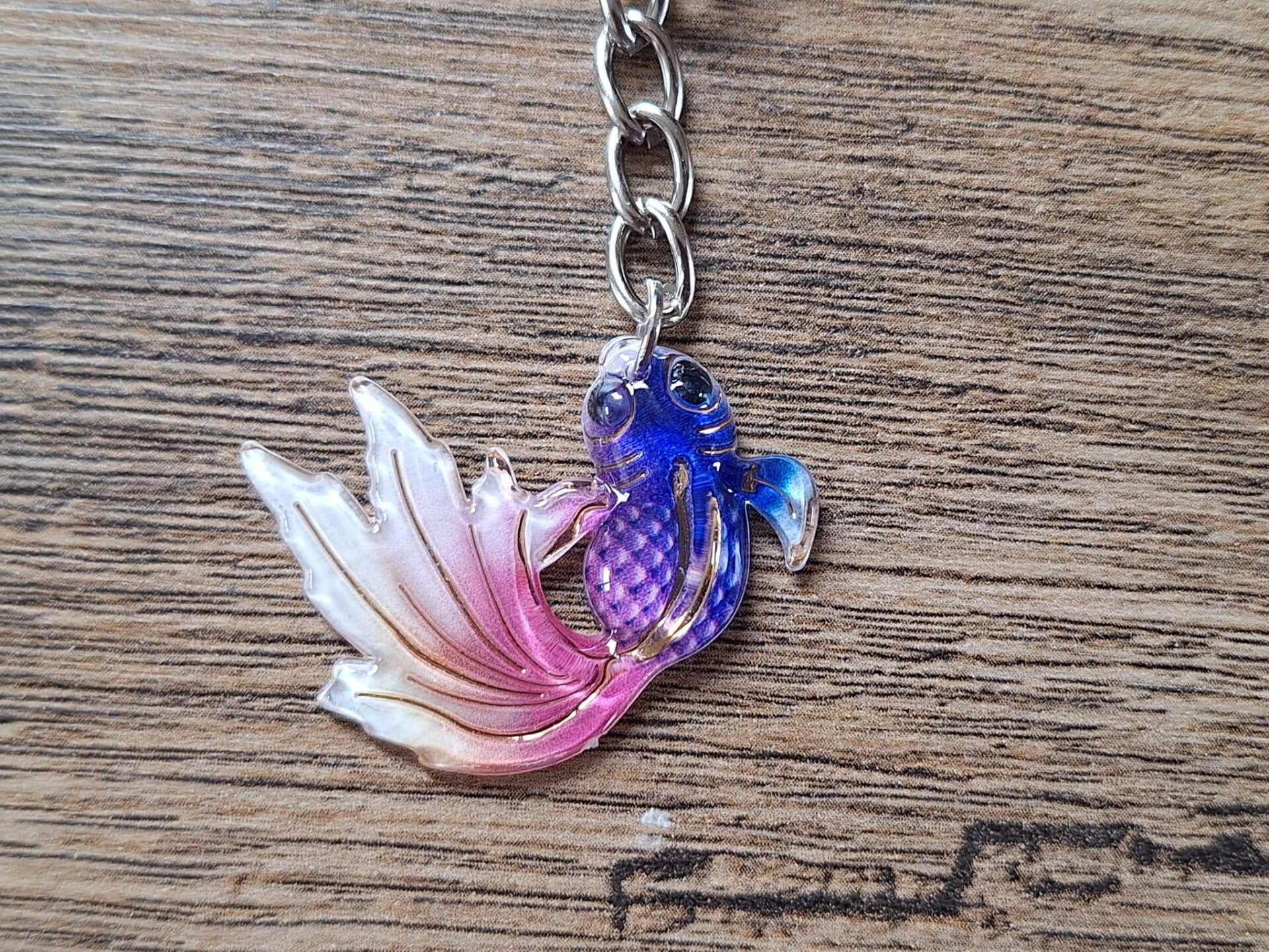Leuk om aan een sleutel of tas te hangen, of als cadeau te geven.De sleutelhanger is handgemaakt met een leuk dier figuurtje : Goudvis !!Het figuurtje is ongeveer 2,5cm hoog, 3cm breed en ongeveer 3mm dik.Materiaal : Hars