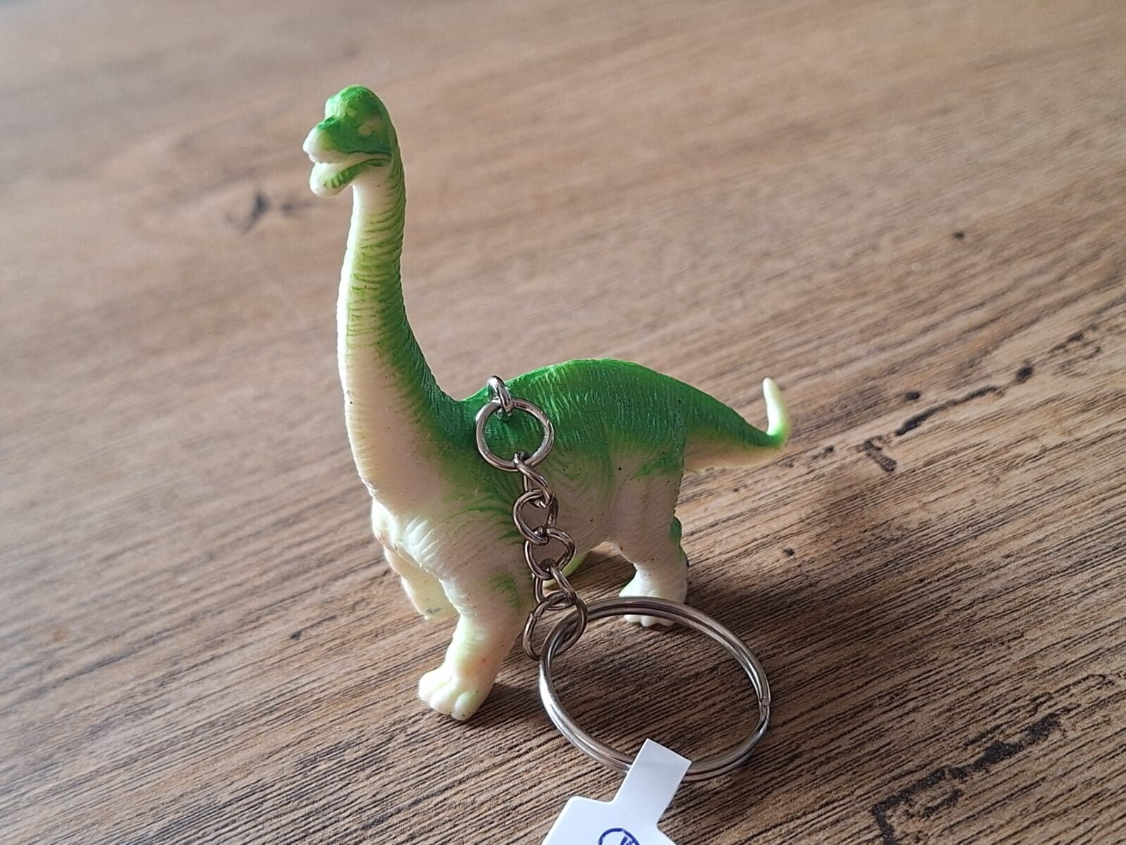 De sleutelhanger is handgemaakt met een leuk dino figuurtje : Brachiosaurus !!Het figuurtje is ongeveer 7cm hoog en ongeveer 6,5cm lang.Materiaal : pvc.