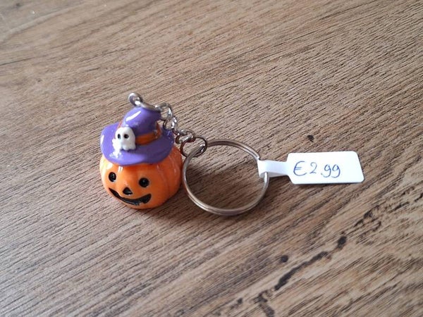 Leuk om aan een sleutel of tas te hangen, of als cadeau te geven.De sleutelhanger is handgemaakt met een leuk Halloween figuurtje Pompoen !!Het figuurtje is ongeveer 3cm groot.Materiaal : Kunststof.