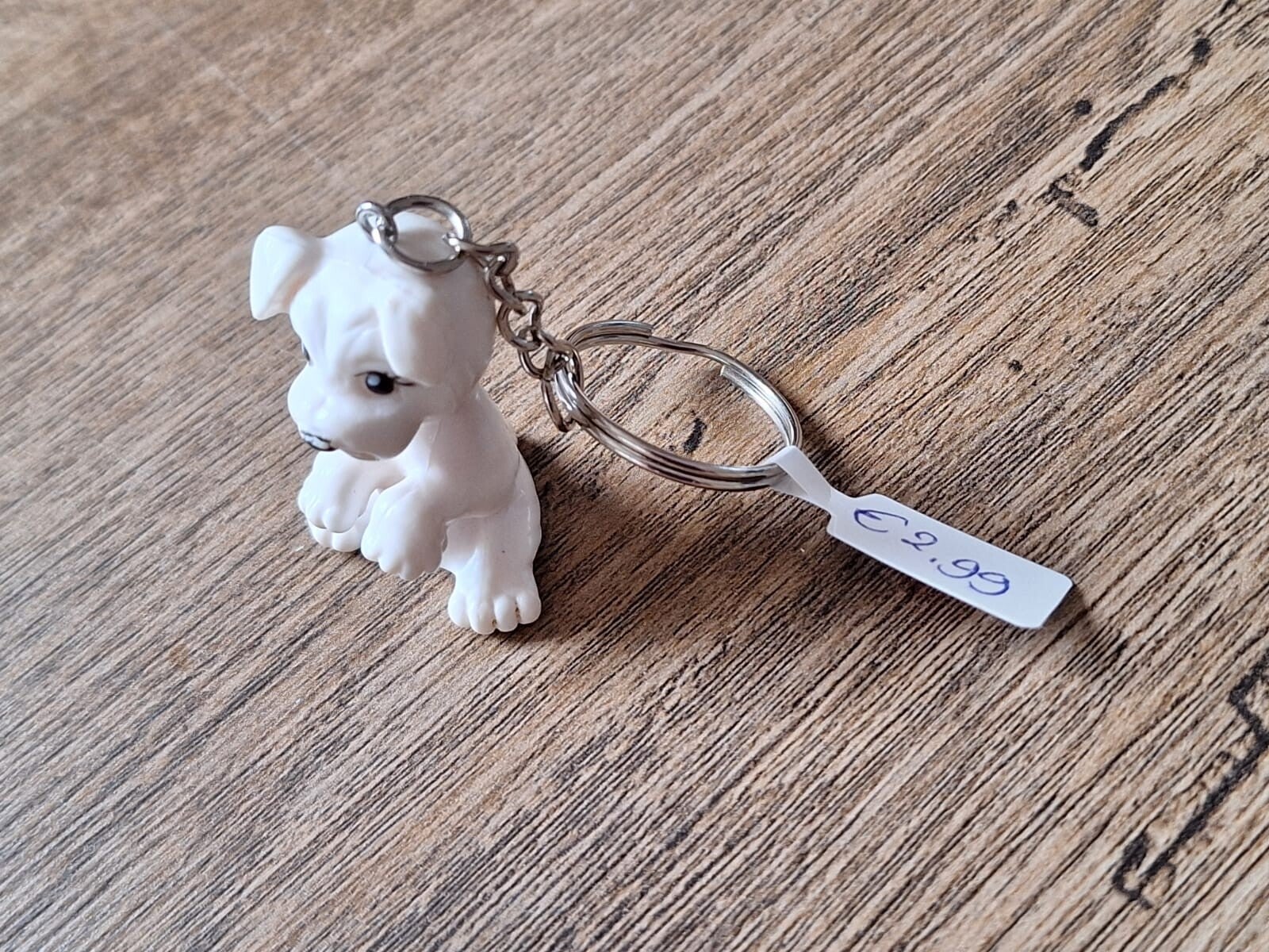 De sleutelhanger is handgemaakt met een leuk dier figuurtje : Wit Hondje !!Het figuurtje is ongeveer 4cm groot.Materiaal : PVC.