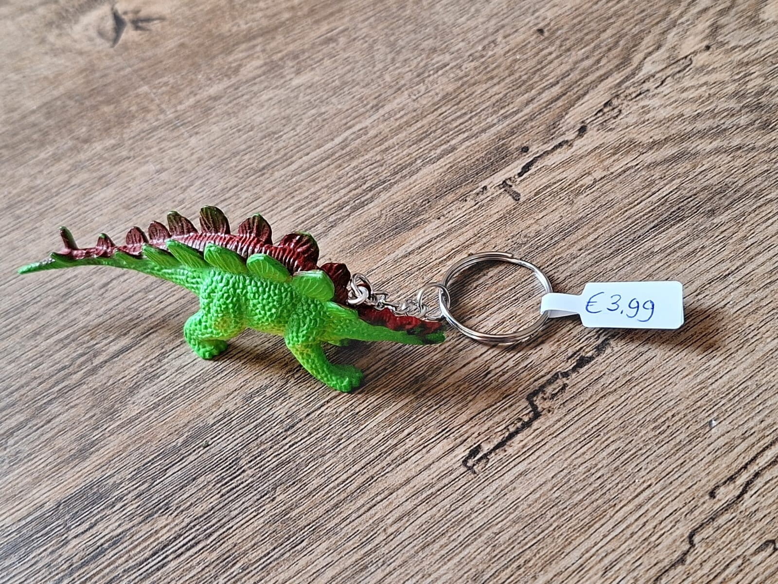 De sleutelhanger is handgemaakt met een leuk dino figuurtje : Stegosaurus !!Het figuurtje is ongeveer 3cm hoog en ongeveer 9,5cm lang. Materiaal : pvc.