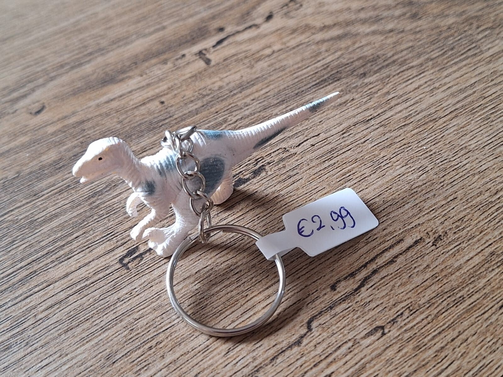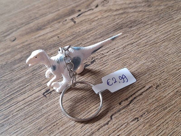 De sleutelhanger is handgemaakt met een leuk dino figuurtje : Witte Raptor !!Het figuurtje is ongeveer 3,5cm hoog en ongeveer 6cm lang. Materiaal : pvc.