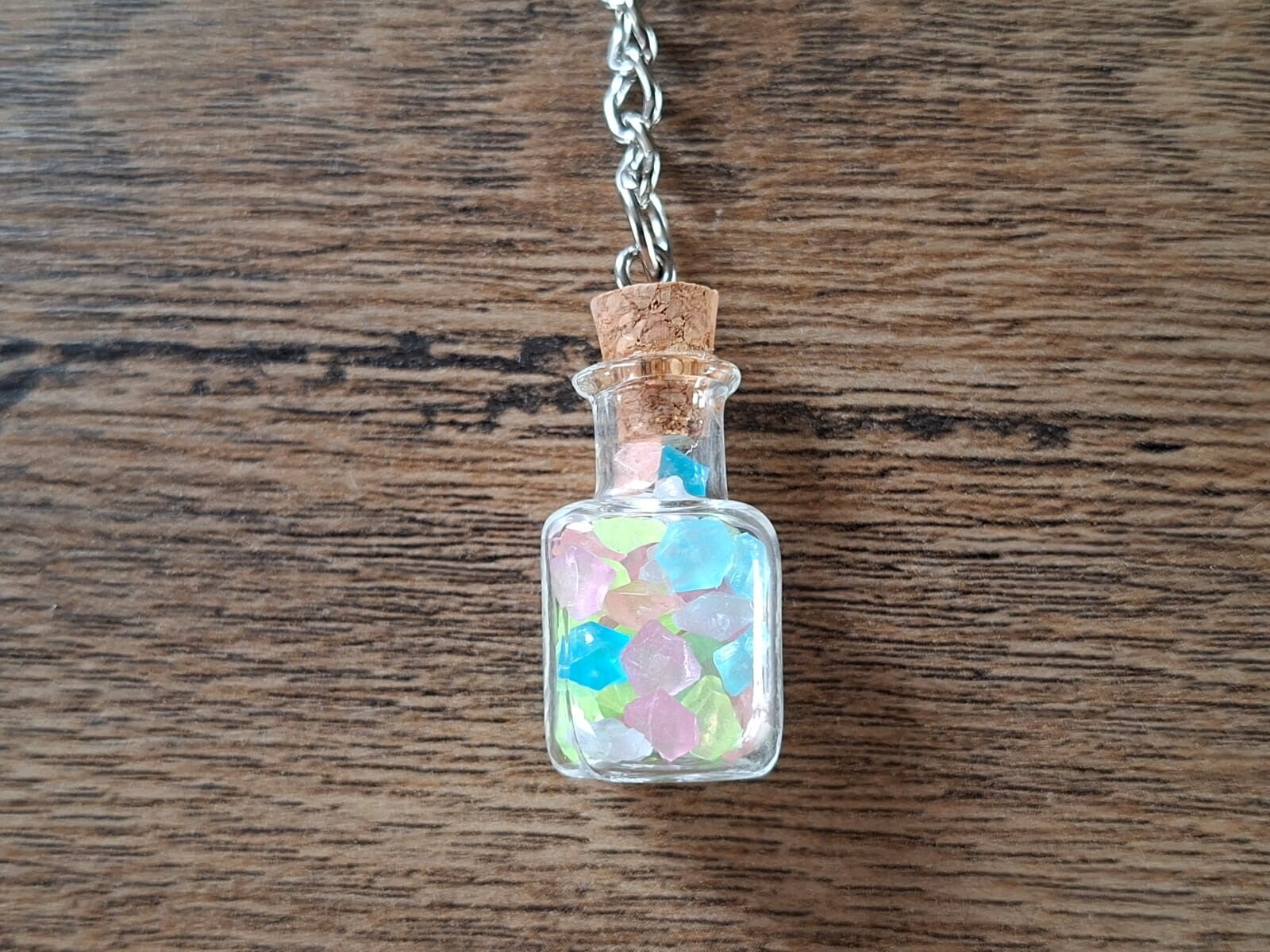 Leuk om aan een sleutel of tas te hangen, of als cadeau te geven.De sleutelhanger is handgemaakt met een leuke hanger : Vierkant Flesje !!