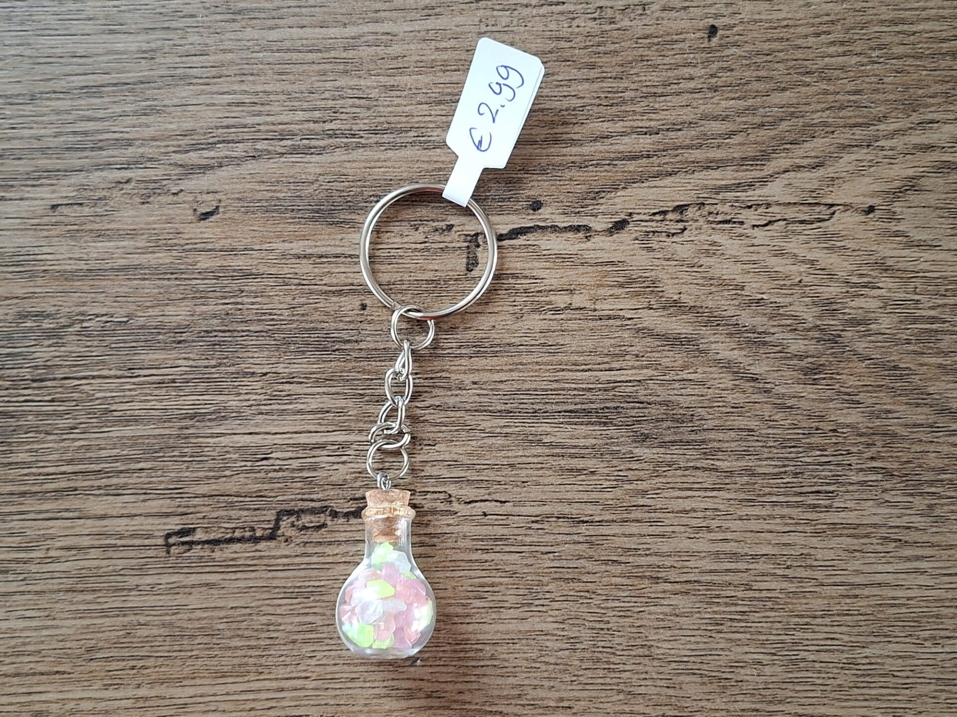 Leuk om aan een sleutel of tas te hangen, of als cadeau te geven.De sleutelhanger is handgemaakt met een leuke hanger : Rond Flesje !!