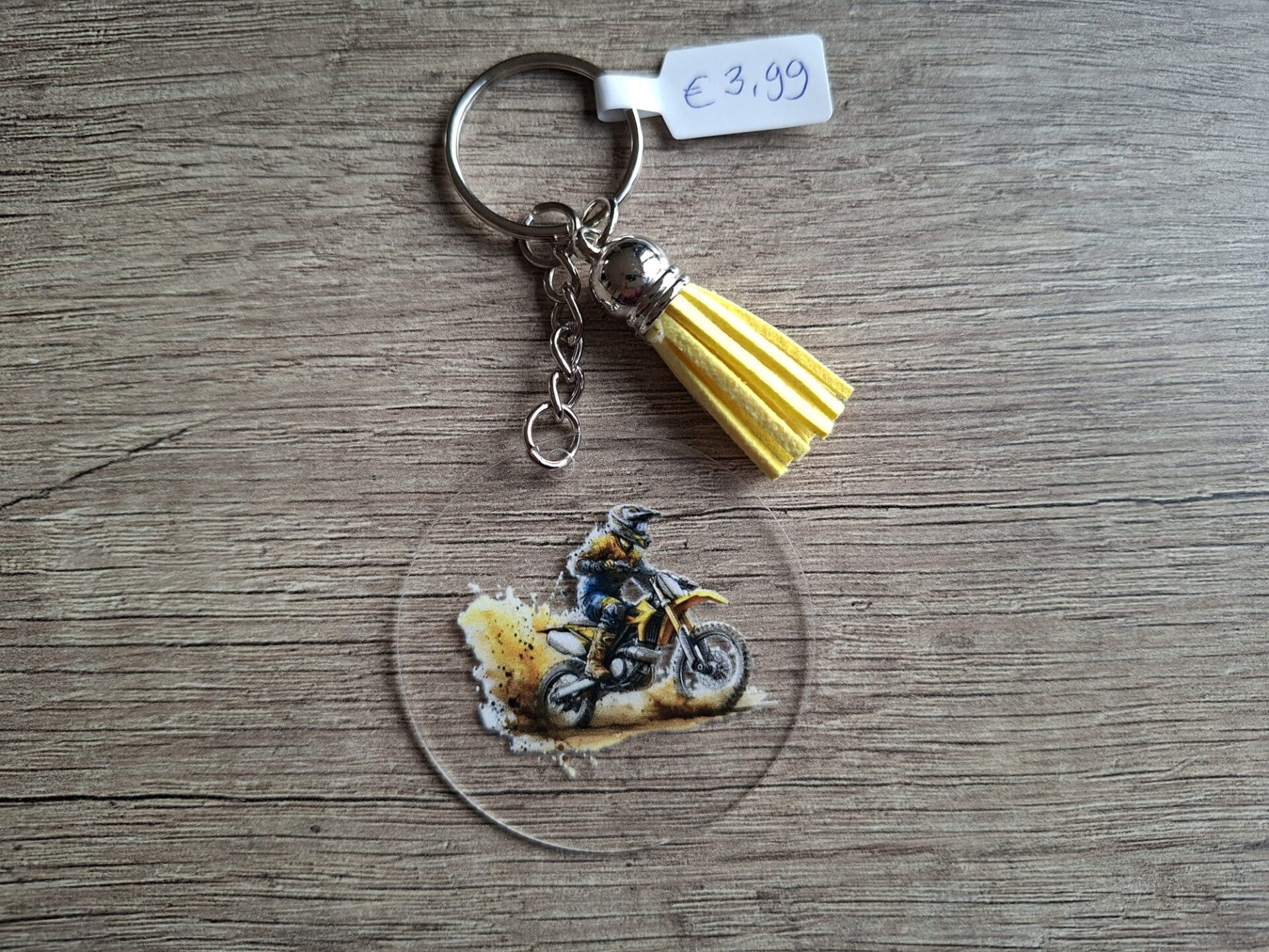 De sleutelhanger is handgemaakt met een 2D ronde hanger met cross-motor plaatje aan 1 zijde !!