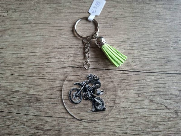 De sleutelhanger is handgemaakt met een 2D ronde hanger met cross-motor plaatje aan 1 zijde !!