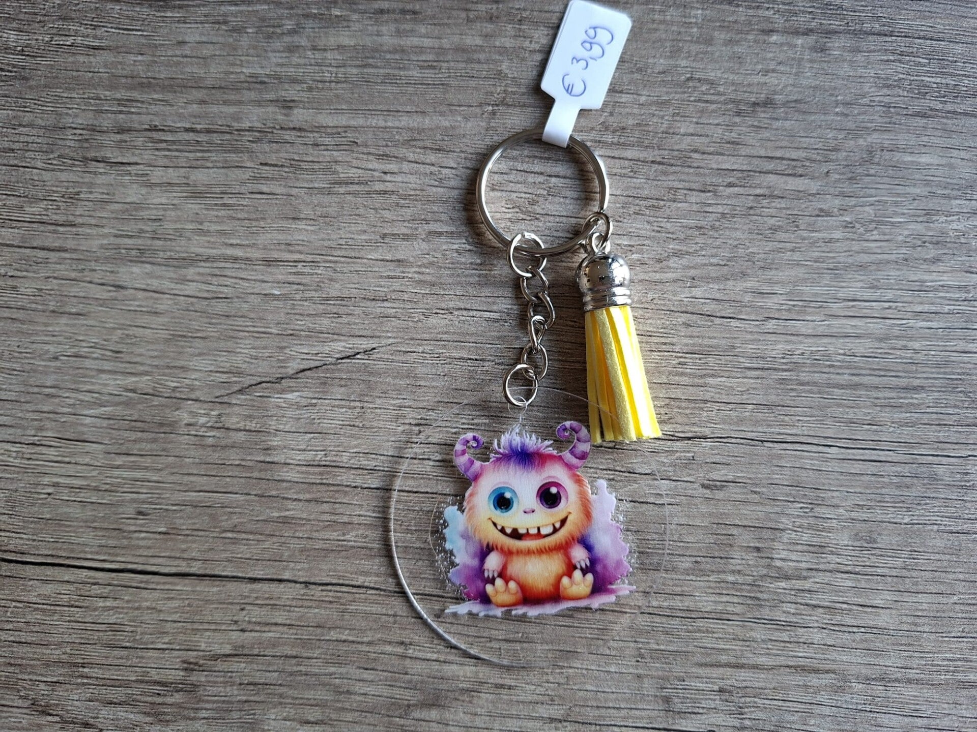 De sleutelhanger is handgemaakt met een 2D ronde hanger met leuk monster plaatje aan 1 zijde !!