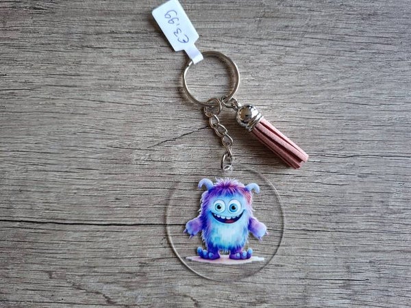 De sleutelhanger is handgemaakt met een 2D ronde hanger met leuk monster plaatje aan 1 zijde !!