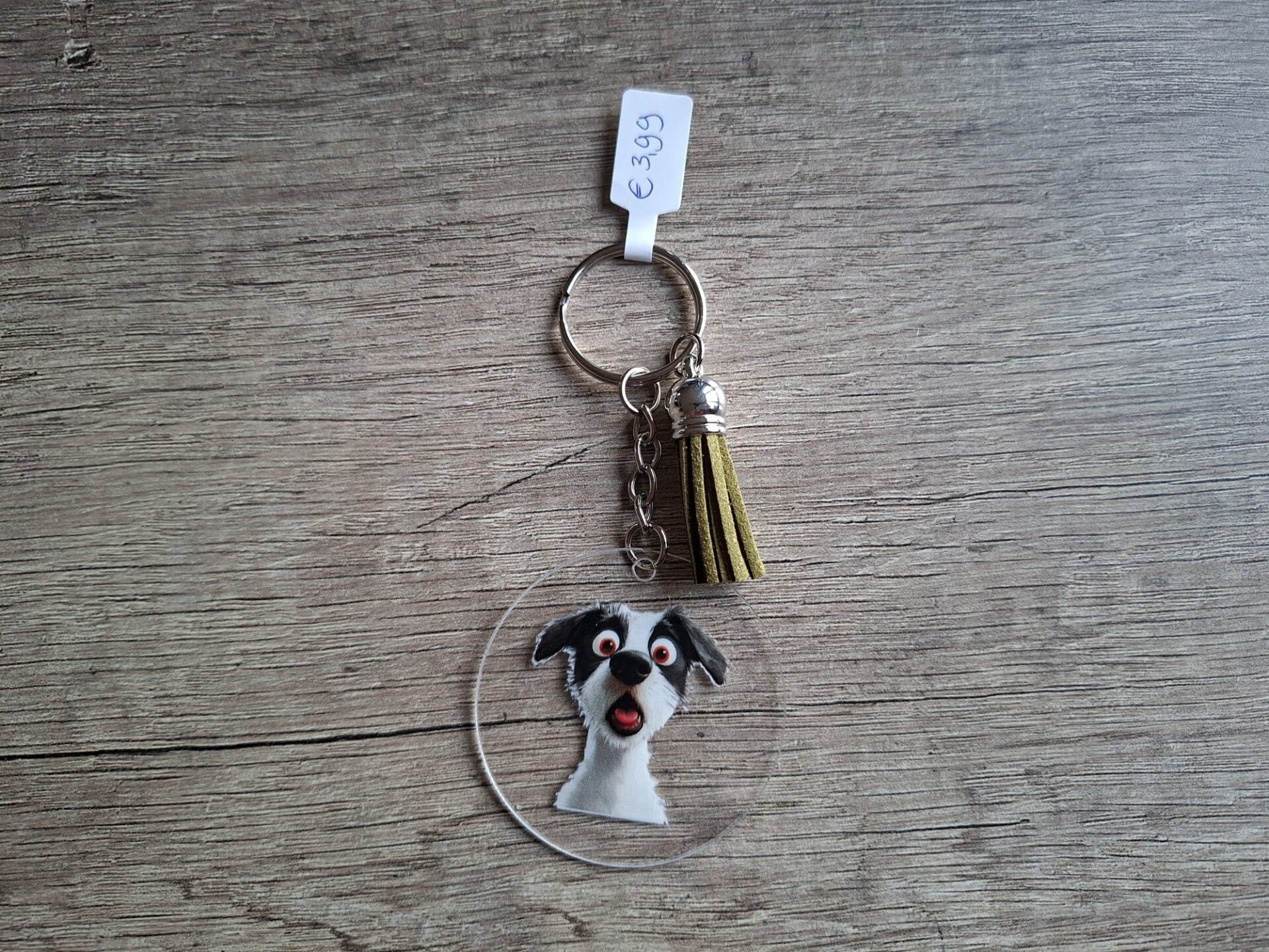 De sleutelhanger is handgemaakt met een 2D ronde hanger met een plaatje van een grappig hondje aan 1 zijde !!
