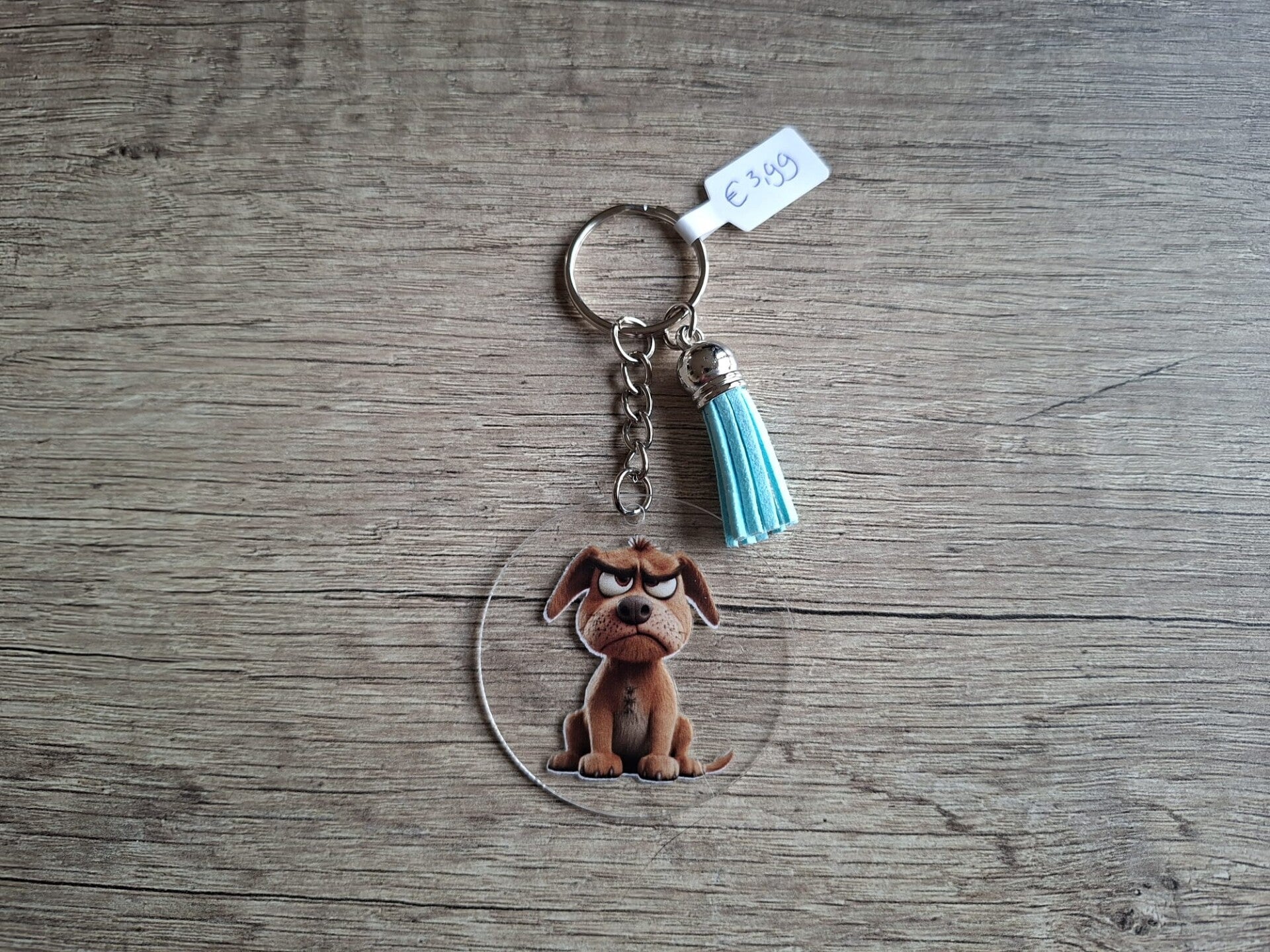 De sleutelhanger is handgemaakt met een 2D ronde hanger met een plaatje van een grappig hondje aan 1 zijde !!