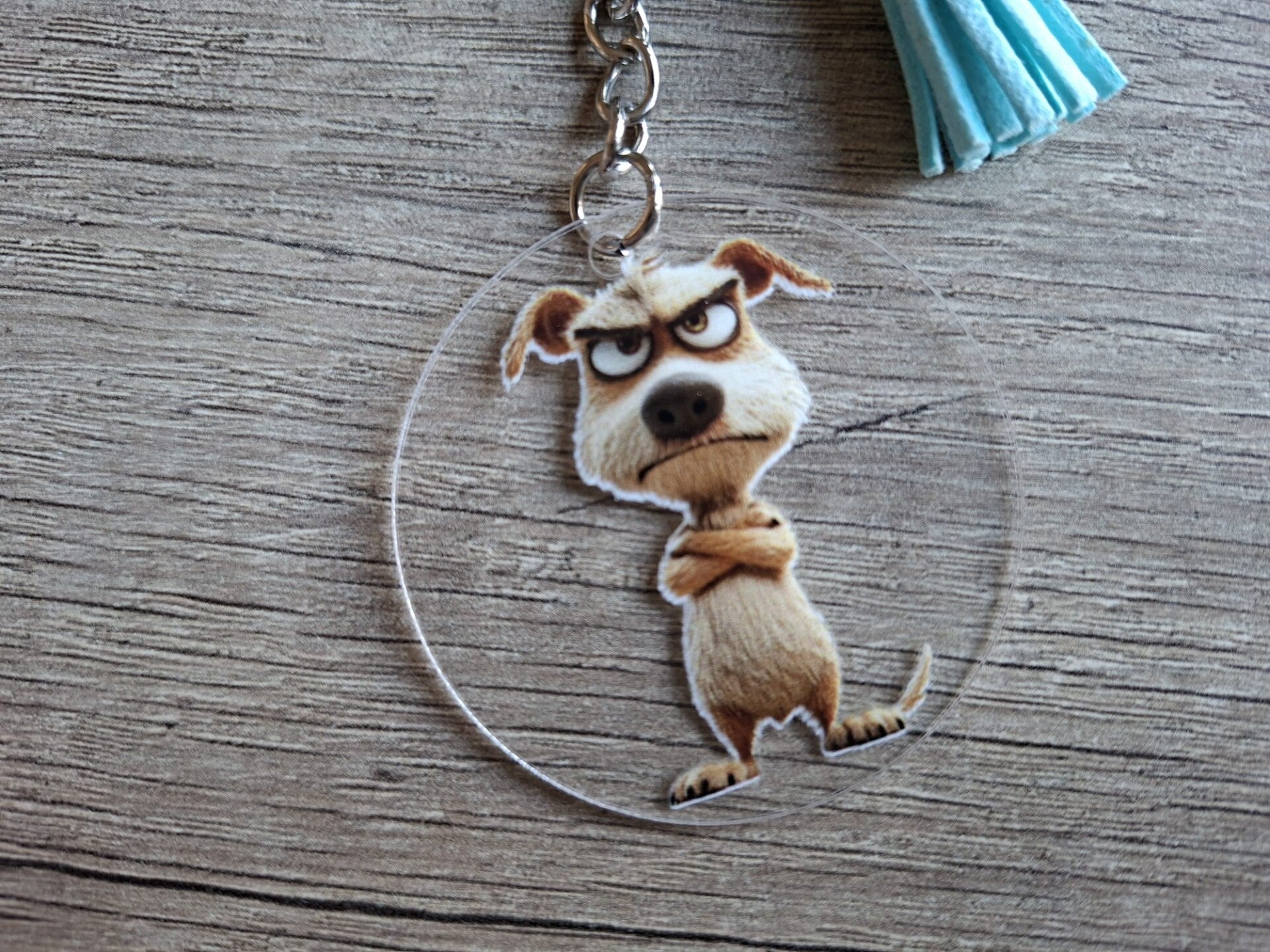 De sleutelhanger is handgemaakt met een 2D ronde hanger met een plaatje van een grappig hondje aan 1 zijde !!
