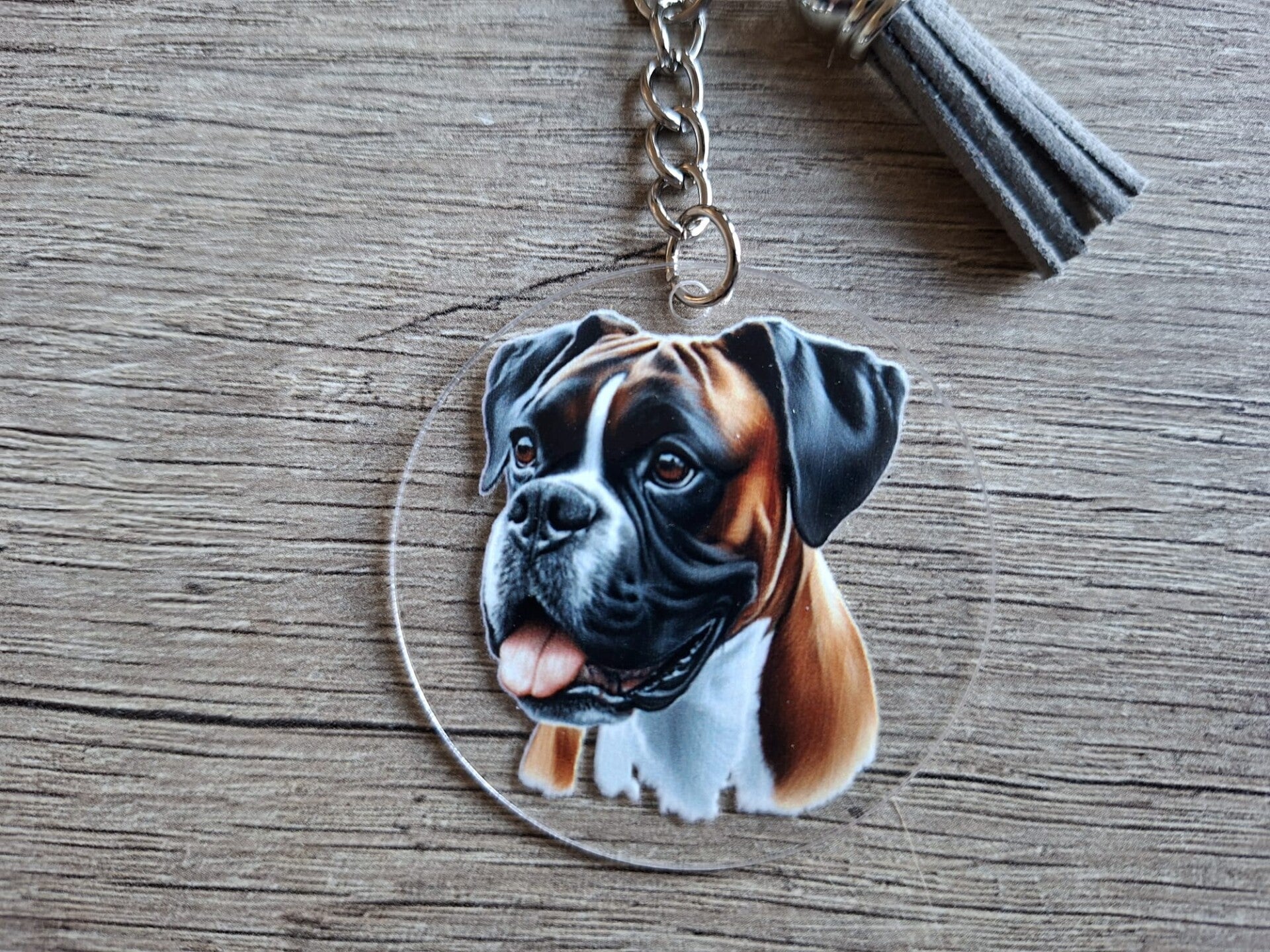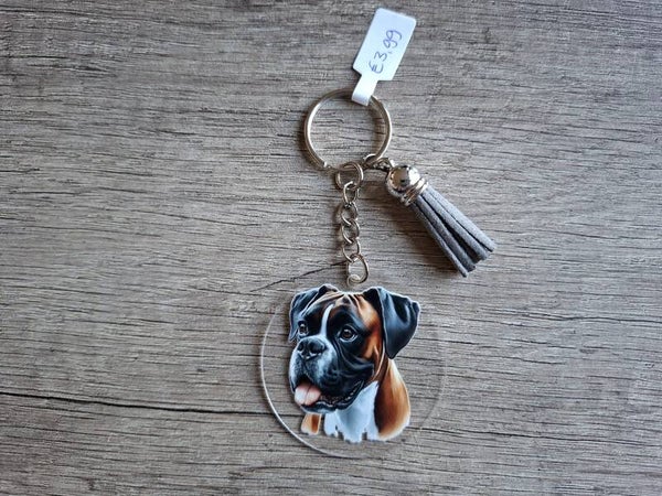 De sleutelhanger is handgemaakt met een 2D ronde hanger met een plaatje van een Boxer aan 1 zijde !!