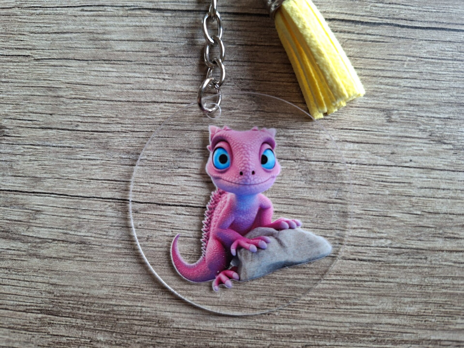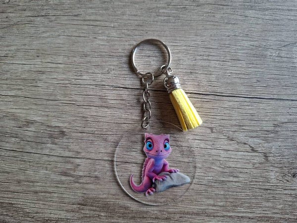 De sleutelhanger is handgemaakt met een 2D ronde hanger met een plaatje van een hagedis aan 1 zijde !!