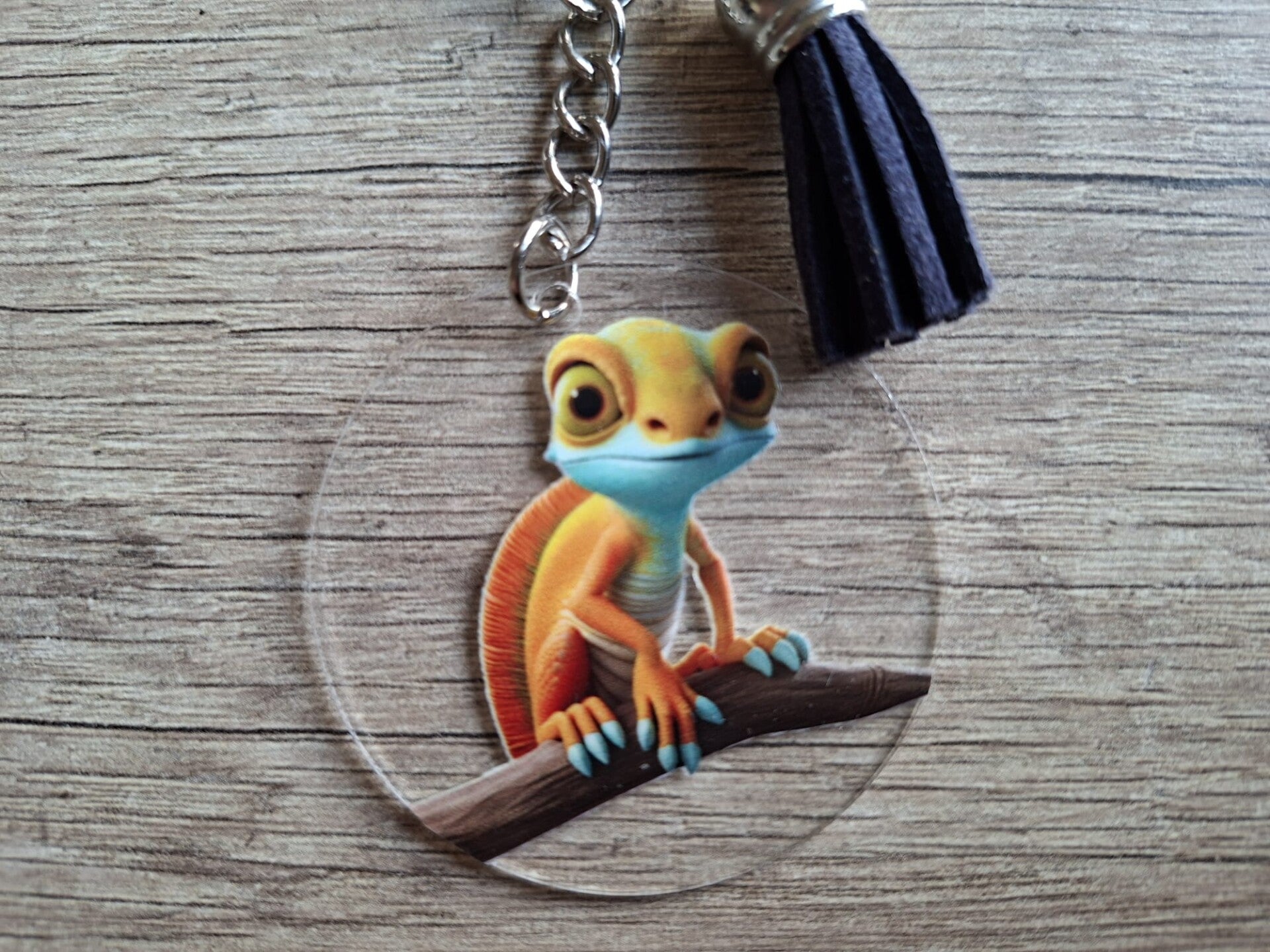 De sleutelhanger is handgemaakt met een 2D ronde hanger met een plaatje van een hagedis aan 1 zijde !!