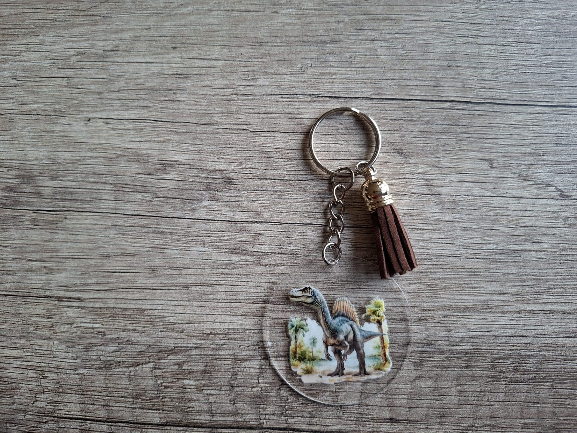 De sleutelhanger is handgemaakt met een 2D ronde hanger met Spinosaurus plaatje aan 1 zijde !!