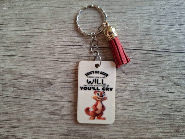 De sleutelhanger is handgemaakt met een houten hanger met een Tekst aan 1 zijde !!