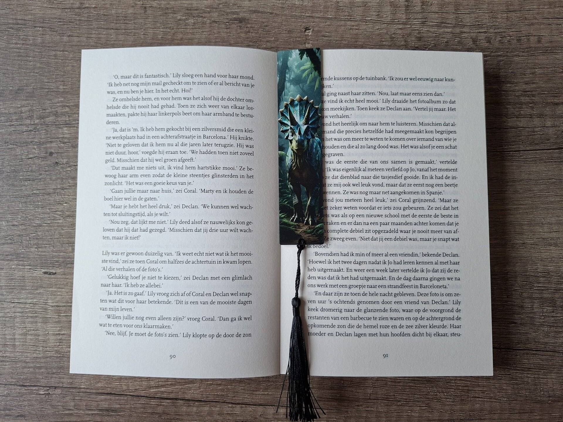 De Boekenlegger is handgemaakt met een leuk dino ontwerp aan 1 zijde : Triceratops !!