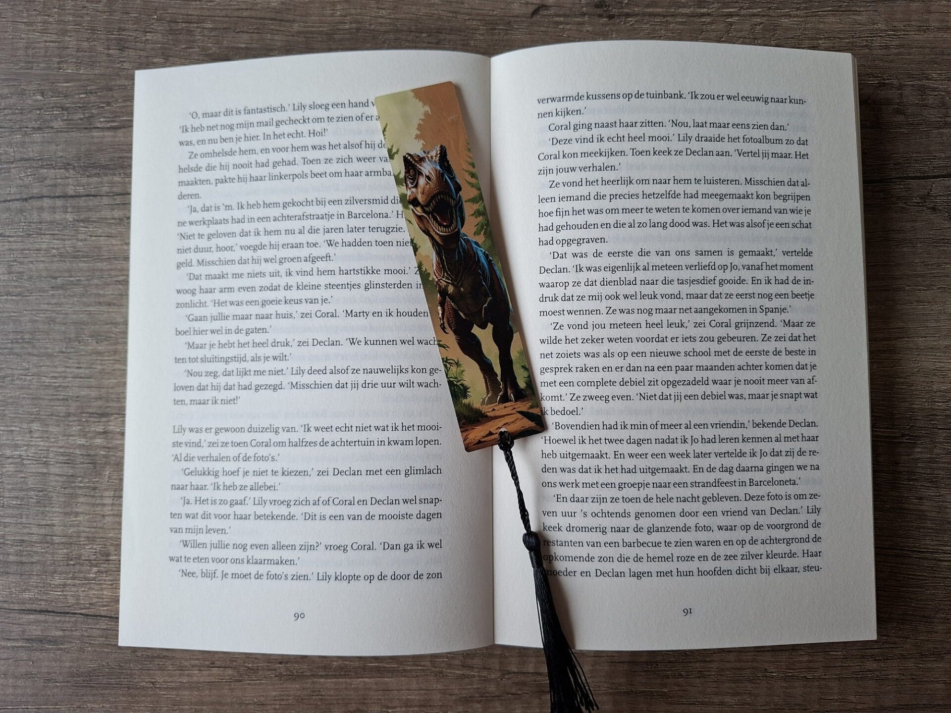 De Boekenlegger is handgemaakt met een leuk dino ontwerp aan 1 zijde : T-Rex !!