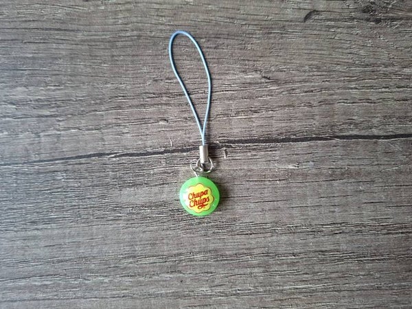 De telefoonhanger is handgemaakt met een leuk hangertje : Groene Chupa Chups !!