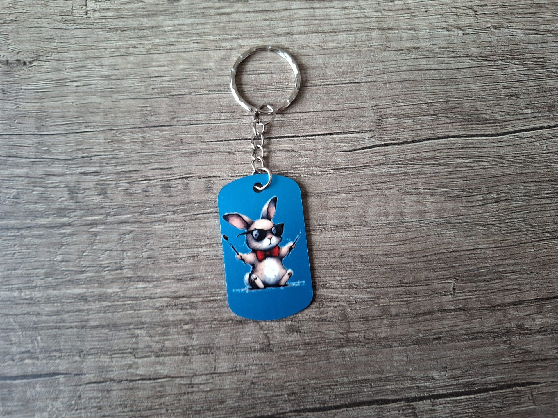 De sleutelhanger is handgemaakt van een Blauwe Tag met een plaatje van een Coole Konijn aan 1 zijde !!