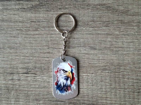 De sleutelhanger is handgemaakt van een Zilverkleurige Tag met een plaatje van een Adelaar aan 1 zijde !!