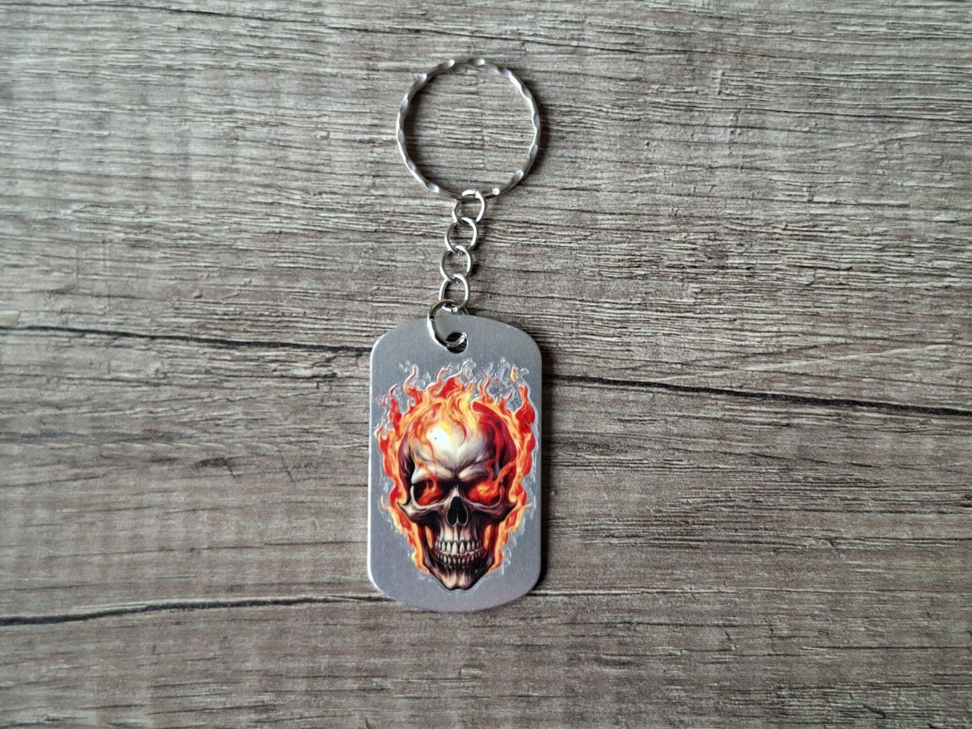 De sleutelhanger is handgemaakt van een Zilverkleurige Tag met een plaatje van een Vuur Schedel aan 1 zijde !!