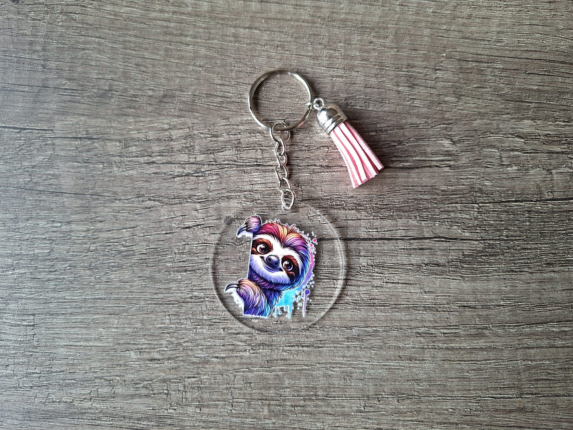 De sleutelhanger is handgemaakt met een 2D ronde hanger met een plaatje van een dier aan 1 zijde : Luiaard !!